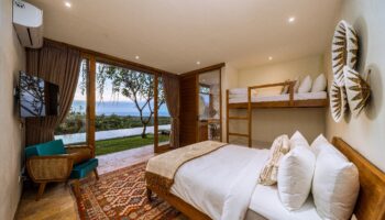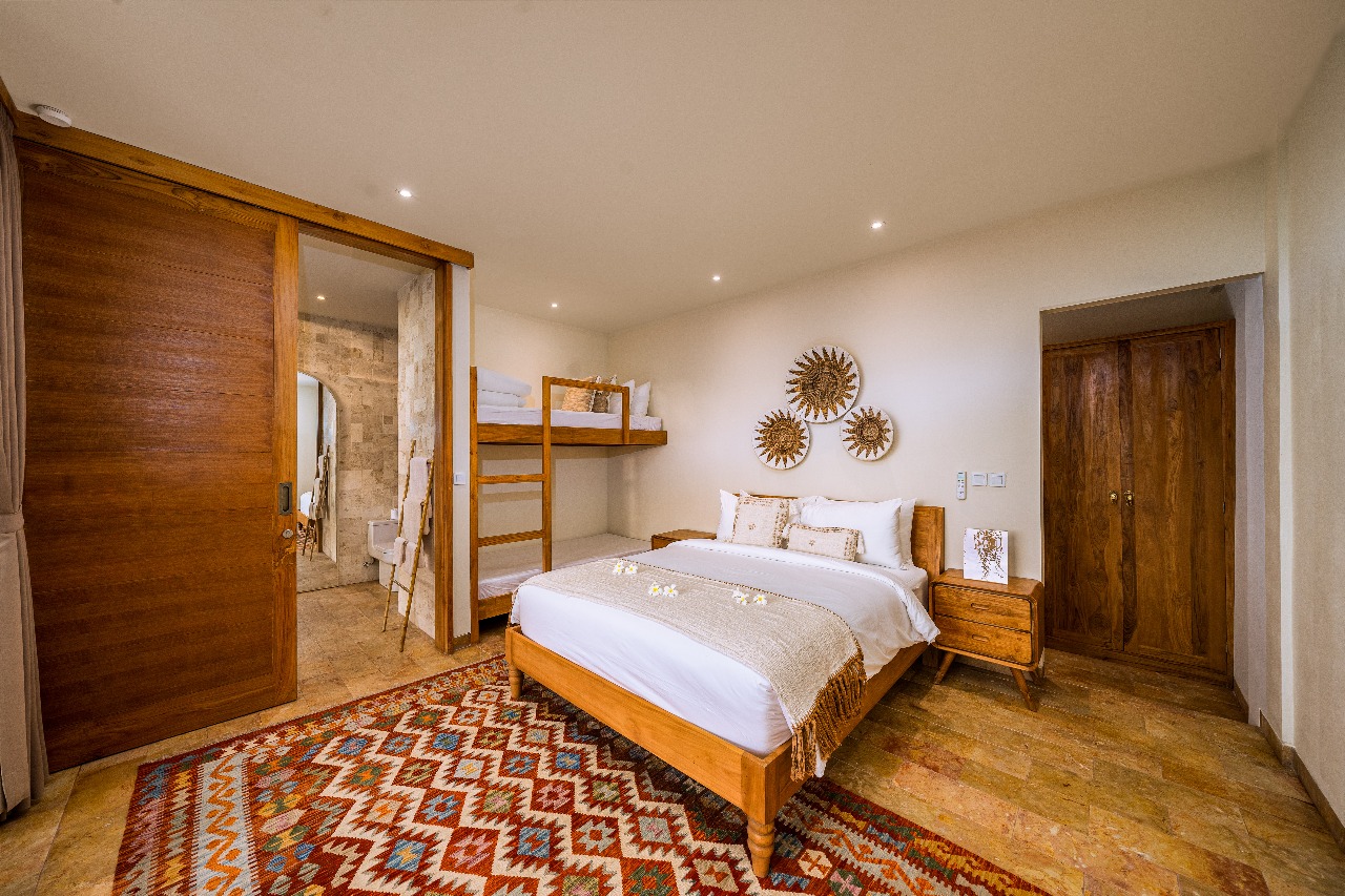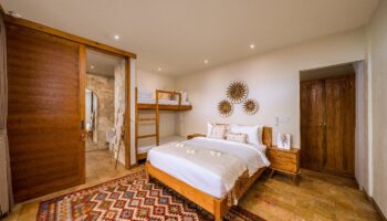 Two suites: the first with a king-size bed, walk-in closet, and en-suite bathroom, and the second with a queen-size bed, bunkbed, walk-in closet, and en-suite bathroom.